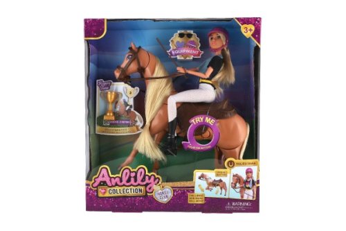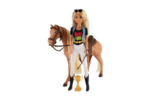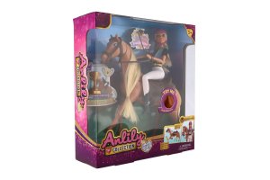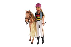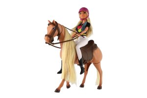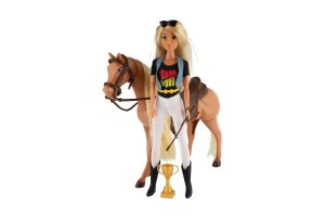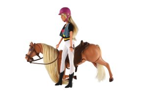Všechny malé milovnice koní potěší panenka žokejka s koníkem, který má dlouhou hřívou a ocas. Panence nechybí jezdecké oblečení a helma. Koník má sedlo a uzdu a hýbe hlavou a končetinami. Rozměry balení 32 x 36 x 11 cm. Vhodné pro děti od 3 let.