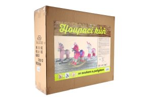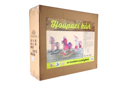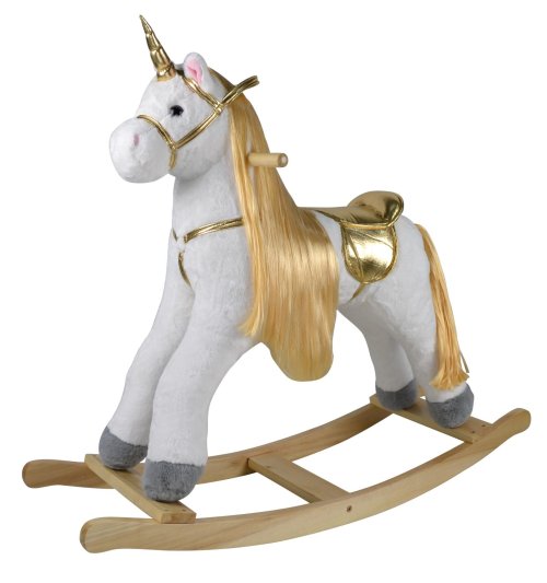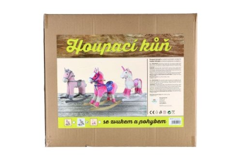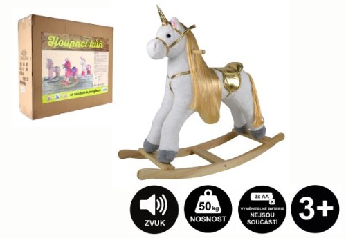 Heboučký houpací jednorožec po zmáčknutí ouška řehtá a hýbe ocáskem. Po zmáčknutí druhého ouška vydává zvuky klapotu podkov při klusu a hýbe ocáskem. Designový bílo zlatý jednorožec udělá radost ne jedné malé princezně! Baterie se vkládají do pouzdra umístěného na bříšku. Hračka pomáhá dítěti rozvíjet koordinaci pohybů a podněcuje jeho představivost. Návod na sestavení a vložení baterií je uvnitř krabice. 3ks baterií AA nejsou součástí balení. Nosnost 50 kg. Výška koně: 71 cm Výška sedla: 47 cm Rozměr balení 70 x 21 x 21 cm Vhodné pro děti od 3 let
