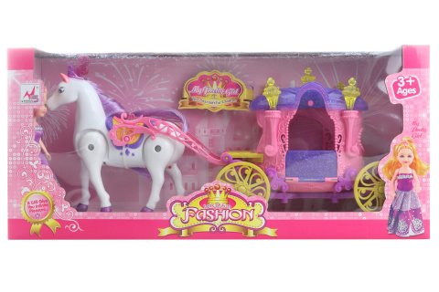 Koník s kočárem pro malé panenky. Po vložení baterií koník chodí a hraje. Napájení na 2 AA baterie (nejsou součástí balení). Kočár pro panenky svítí - napájení na 3 AG13 baterie (nejsou součástí). Součástí balení je také panenka o velikosti cca 13 cm. Rozměry balení cca 45,5 x 21 x 11 cm. Věk 3+