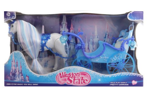 Koník s modrým kočárem. Po vložení baterií koník chodí, hraje a na kočáru svítí lucerničky. Napájení na 2 AA baterie (nejsou součástí balení). Rozměry balení cca 56 x 30 x 19 cm. Věk 3+