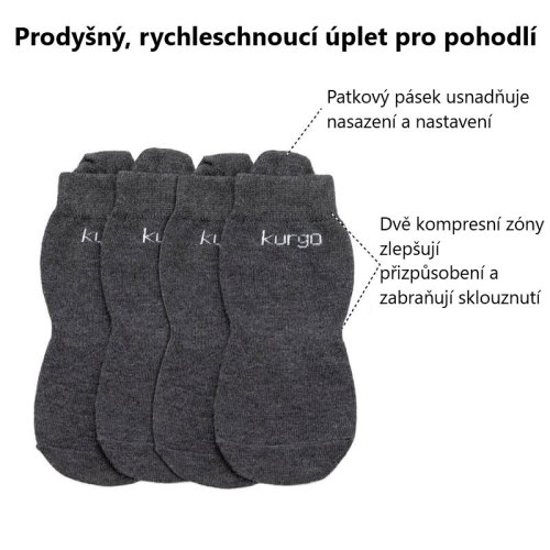 Ponožky Kurgo® Blaze jsou navrženy tak, aby zlepšily padnutí a komfort bot Kurgo® Blaze a udržely nohy Vašeho psa na cestách v suchu. Dvě kompresní zóny zajišťují bezpečné uchycení a zabraňují sklouznutí ponožky, když je pejsek zaneprázdněn objevováním okolí. Prodyšná tkanina odvádějící vlhkost zajišťuje rychlé schnutí nejen pro štěňata, která milují louže. Ponožky pro psy jsou dobrým nápadem i z jiného důvodu: usnadňují obouvání a zouvání bot tím, že chrání jeho záprstí - ten legrační malý prst navíc na vnitřní straně nohy. Praktické poutko je bonusem, který Vám pomůže při nasazování ponožek na tlapky Vašeho psího parťáka a jejich úpravě.