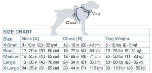 | Doporučená velikost | Obvod krku (A) v cm | Obvod hrudníku (B) v cm | Hmotnost psa v kg |