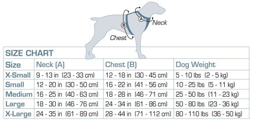 | Doporučená velikost | Obvod krku (A) v cm | Obvod hrudníku (B) v cm | Hmotnost psa v kg |