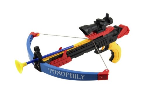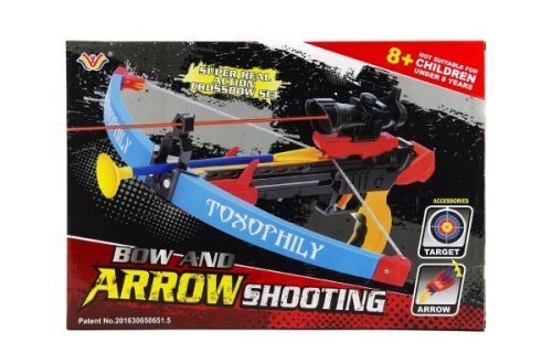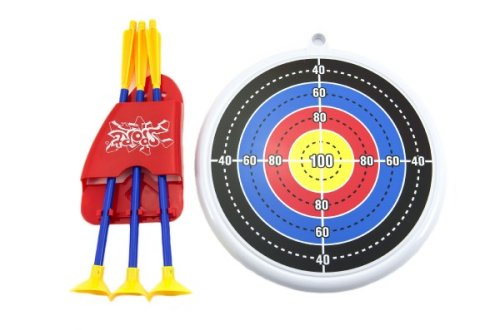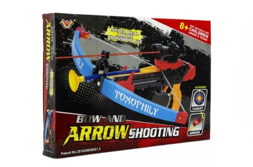 Barevná plastová kuše se třemi šípy a terčem nabízí bezpečnou střelbu na cíl. Konce šípů jsou opatřeny přísavkami. Dětem tak nehrozí zranění. Vhodné od 3 let.