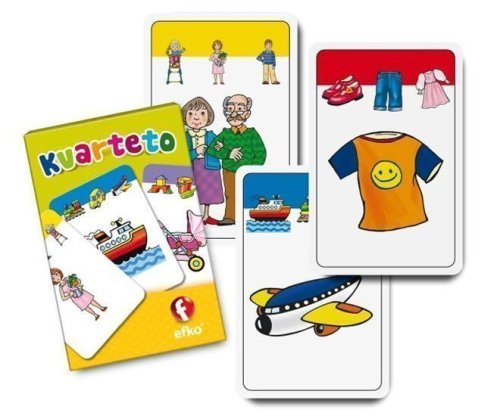 Karetní hra kvarteto pro nejmenší děti s tématickými skupinami obrázků - hračky, dopravní prostředky, oblečení... Hra obsahuje 32 karet, které jsou rozděleny do 8 skupin po čtyřech kartách, které k sobě patří (kvarteta). Hry se musí zúčastnít minimálně 3 hráči, mezi které se rozdělí všechny karty. Vyhrává ten, kdo sestaví nejvyšší počet kvartet. Balení: 32 karet v papírové krabičce