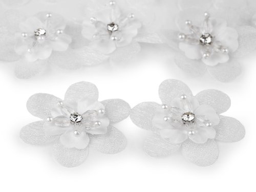 Elegantní květ se zdobeným středem je složený ze 2 vrstev. Spodní část květu je tuhá organza, horní část je zesílená a tvarovaná. Střed je ručně dozdobený broušeným kamínkem v kotlíku a korálky, působí velice romanticky. Broušený kamínek ve středu květu dodává třpytivý efekt, zatímco korálky rozprostřené po okvětí zajišťují bohatý a výrazný vzhled. Použití: Květ můžete našít či nalepit na svetříky, halenky, šaty, kabátky, psaníčka, tašky nebo vlasové ozdoby, klobouky a čepice.