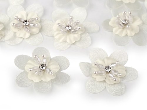 Elegantní květ se zdobeným středem je složený ze 2 vrstev. Spodní část květu je tuhá organza, horní část je zesílená a tvarovaná. Střed je ručně dozdobený broušeným kamínkem v kotlíku a korálky, působí velice romanticky. Broušený kamínek ve středu květu dodává třpytivý efekt, zatímco korálky rozprostřené po okvětí zajišťují bohatý a výrazný vzhled. Použití: Květ můžete našít či nalepit na svetříky, halenky, šaty, kabátky, psaníčka, tašky nebo vlasové ozdoby, klobouky a čepice.