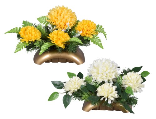 Vazba z umělých květin. Aranžmá z umělých květin imitujících chryzantémy je umístěno ve zlaté nádobě, doplněné jehličinou, kapradinou či zelenými lístky. Vhodná sezóna: podzim. Rozměry: šířka 36 cm, výška 23 cm. Barva: mix barev.