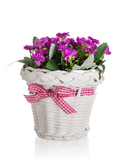 Květina v ratanovém košíku se stuhou 13 x 14 cm, fialová je umělá květina, která slouží jako náhrada živých rostlin a skvěle se hodí pro dekorování bytových prostor. Výhodou umělých květin je, že se o ně nemusíte starat.