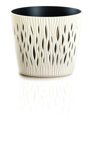 Plastový matný obal na květník se zvlněnými vertikálními drážkami se vzhledem pouštního písku. Je vhodný do interiéru i venkovních prostor - je odolný vůči UV záření. Šířka: 19 cm, výška: 17 cm.