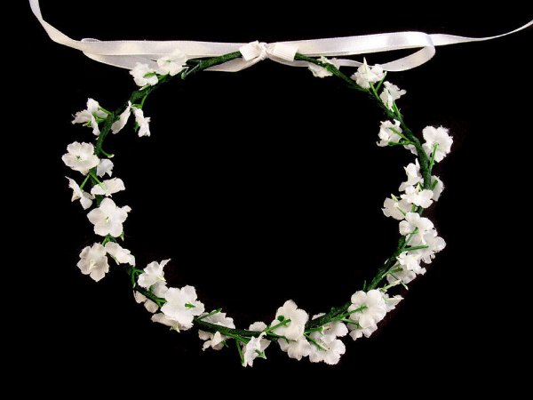 Romantický věneček s drobnými květy můžete nosit jako ozdobu vlasů nebo jej můžete použít k dekoračním účelům. Květy jsou připevněné k drátěné kostře, která je obalená papírem. Díky drátěnému základu můžete věneček tvarovat, velice příjemně se nosí. Vzadu si jej můžete saténovou mašlí zavázat na potřebnou velikost. Mašle působivě dozdobí zadní část hlavy. Věneček můžete ještě ozdobit podle své fantazie samostatnými květy nebo jinými drobnými dekoracemi. Květinový věneček v nevinné bílé barvě využijí dívky, které čeká První svaté přijímání. Neměl by chybět v účesu žádné družičky.