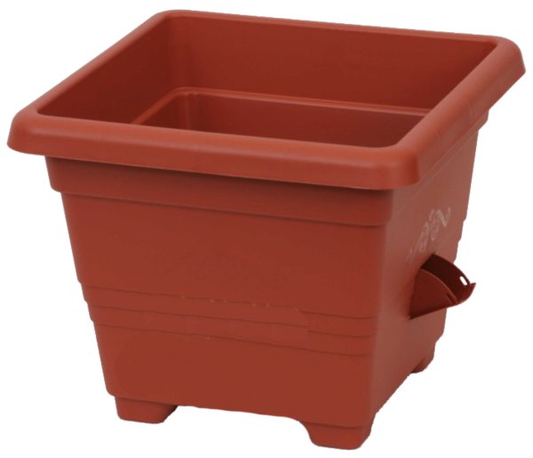 Květník čtvercového půdorysu s hladkým povrchem a nožičkami umožňujícími odtok vody. Kromě knotu obsahuje okénko na zalévání, k odtoku přebytečné vody při dešti a přístupu vzduchu ke kořenům. Rozměry: 25 x 25 cm, výška: 20 cm.