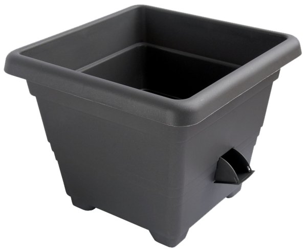 Květník čtvercového půdorysu s hladkým povrchem a nožičkami umožňujícími odtok vody. Kromě knotu obsahuje okénko na zalévání, k odtoku přebytečné vody při dešti a přístupu vzduchu ke kořenům. Rozměry: 25 x 25 cm, výška: 20 cm.