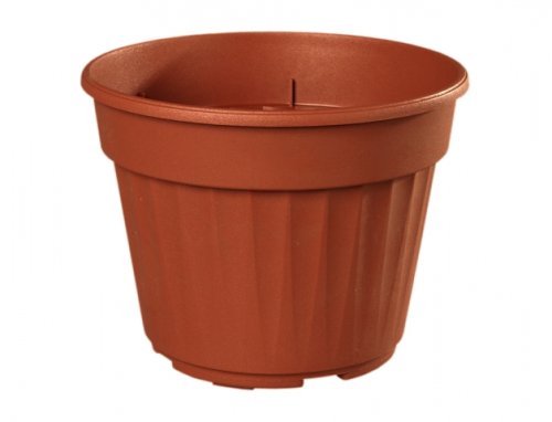 Plastový lehčený matný květník v barvě terakoty s vylisovanými svislými vlnkami téměř po celé výšce. Pod okrajem je rovný pruh, který je nahoře zakončen okrajem ohnutým směrem ven. Vhodný pro výsadbu rostlin v interiéru i v exteriéru. Rozměry: d. 35 x 29cm.