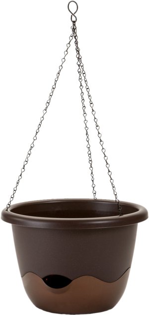 Plastový samozavlažovací květník v moderním dvoubarevném provedení. Součástí je kovový řetízek pro snadné zavěšení, knot, zalévací/přepadový otvor a hladinoměr. Šířka: 30 cm, výška: 20 cm.