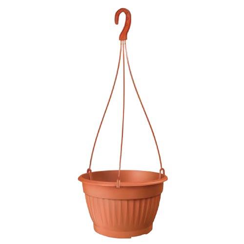 Plastový v půdorysu kulatý jemně kónický závěsný, samozavlažovací květináč v barvě terakoty v části s vylisovanými pruhy, vedenými vertikálně. Horní okraj má širší, ohnutý směrem ven. Používá se k zavěšení s vysazenými převislými rostlinami v interiéru i v exteriéru. Rozměry: d. 23,5 x v. 14,5cm.