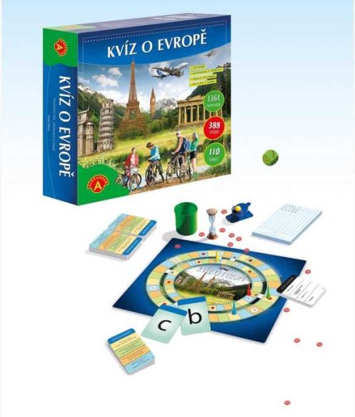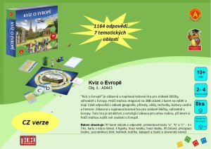 Zábavná a napínavá kvízová hra pro 2-6 zvídavých lidiček od 10 let. Čeká na vás 1164 odpovědí z oblati geografie, přírody, vědy, techniky, kultury umění a historie. Že některou otázku nevíte? Nevadí! Při hře se vše dozvíte. "Kvíz o Evropě" je fascinující a zábavná hra, během které hráči odpovídají na otázky týkající se Evropy. Hráči mohou reagovat na 388 otázek z karet na výběr a mají 1164 odpovědí. Soutěží se ve 4 okruzích otázek: dějepis, zeměpis a kultura, věda a technika, umění a kultura v Evropě. "Kvíz o Evropě" je atraktivní a vzrušující zábava pro celou rodinu kde si hráči mohou zvýšit své znalosti o Evropě. V této velké verzi si můžete také vyzkoušet svojí zručnost střelbou katapultu na cíl. Hráči mohou zvolit variantu hry, kdy využijí přiloženou kuličku a malý katapult a tím ztížit získávání potřebných bodů. Hra obsahuje: karty s otázkami a odpověďmi-97 kspísmenkové karty kategorií-12 kskarta s tématy-1ksbarevné figurky-4kshrací kostka-1kshrací deska-1ksbarevné žetony-80 kspřesýpací hodiny-1 kspoznámkový blok-1 ksplastový kelímek-1 ksplastová kulička-1 ksvystřelovací katapult-1 ksčeský návod ke hře Hlavní vlastnosti: rozvíjí soustředění, vnímavost a pozornostzábavná a zárověň výuková hra1164 odpovědí388 otázek110 karet Dokumentace: návod ke hře CZ