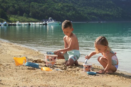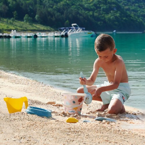 Set na písek s mořským motivem. Obsahuje kyblíček, sítko, hrabičky, lopatičku, konvičku a formičku. Průměr kyblíčku 17 cm, výška kyblíčku 18 cm.