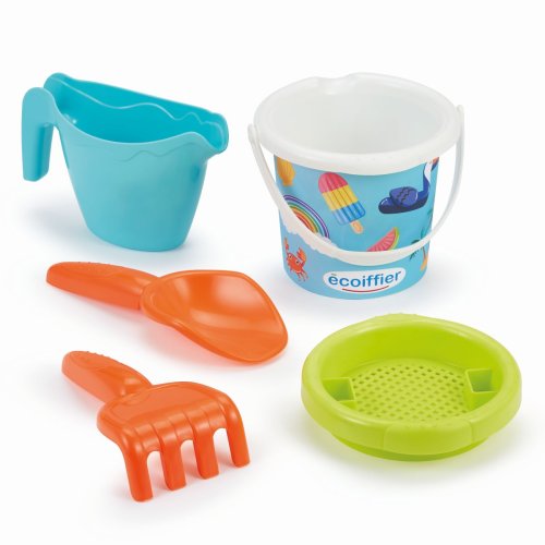 Kyblíček s prázdninovým motivem s konvičkou, sítkem, hrabičkami a lopatičkou. Průměr kyblíčku 12 cm, výška kyblíčku 15 cm.