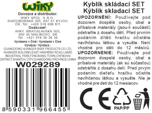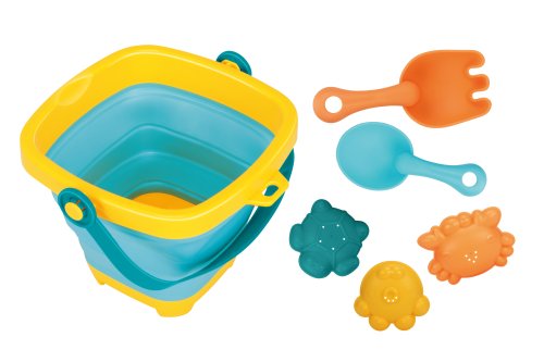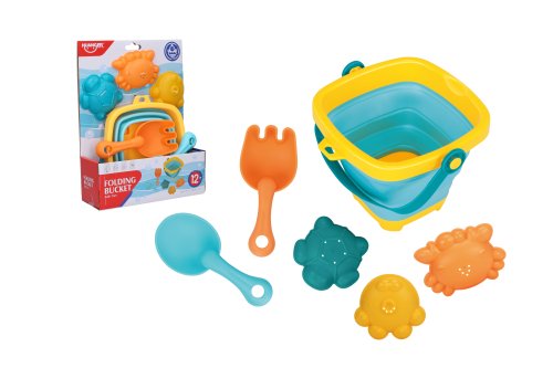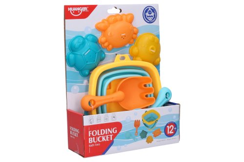 Kyblík skládací do vany nebo na písek. Obsah balení - skládací kyblík 19x18 cm, 3 formičky - želva, krab, žába, hrabičky a lopatka.
