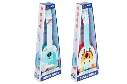 Kytara dětská, motiv africká zvířata. 4 umělé struny. Délka 37 cm. 2 varianty - slon, žirafa.
