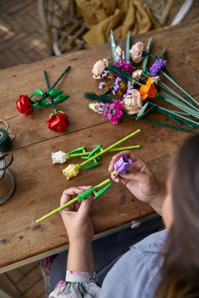 Stylizujte květiny jako profík Všechny detaily kytice jsou vyrobeny z LEGO součástek a lze je přizpůsobit tak, aby zanechaly jedinečný dojem. Většina květin má okvětní lístky, které lze přeuspořádat, takže si můžete užít zábavu při vymýšlení různých designů. Rozeberte stonky a znovu je složte jiným způsobem, čímž změníte výšku a tvar vašich květin. Sada je součástí botanické LEGO kolekce pro dospělé a obsahuje několik dílků z rostlinného plastu, který se trvale udržitelným způsobem vyrábí z cukrové třtiny.