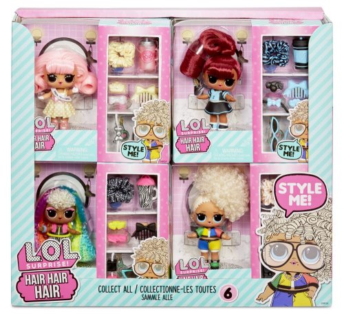Představujeme nové panenky L.O.L. Surprise! Hair Hair Hair! Rozbal všechna nová překvapení, balíčky a panenku L.O.L. Surprise! s překrásnými vlásky. V balení najdeš spoustu doplňků. Krabička, ve které je panenka uložena, může po rozložení zároveň sloužit třeba jako kadeřnický salón. Panenka může měnit barvu v teplé nebo v ledové vodě. Ne všechny části či doplňky mění barvu.