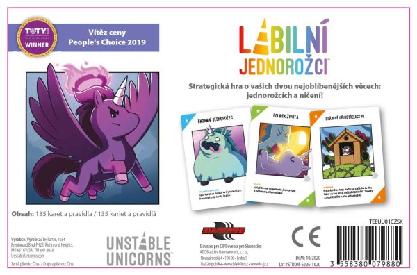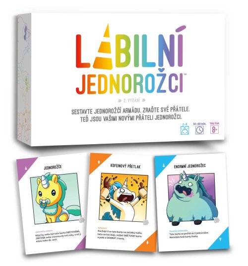 Labilní Jednorožci je strategická karetní hra o dvou oblíbených věcech: jednorožcích a ničení! Začínáte s malým jednorožčetem ve vaší Stáji. Hodně „kjůůůt“! Hlavně se do nich příliš nezamilujte, protože ani jednorožčí mimina nejsou v této hře v bezpečí!Do své armády můžete posbírat více než 20 druhů magických jednorožců s vlastní extra sílou! Postavte svoji armádu tak rychle, jak jen to půjde, jinak budete zničeni nějakým z vašich rádoby přátel. Ať už máte v plánu se mstít nebo bránit svoji Stáj, použijte Magii! Nic ale neuspěchejte, protože někdo by mohl mít kartu ""Íhaha""! Ten, kdo jako první dokončí svoji armádu jednorožců, bude nadosmrti opěvován… minimálně do příští hry. Hodně štěstí!Obsah balení:135 karet1 česká pravidla