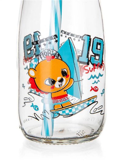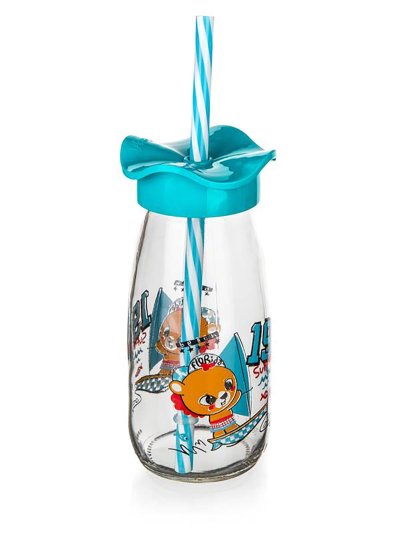 Láhev s brčkem s dětským dekorem. Brčko je opatřeno pojistným kroužkem proti vypadnutí.