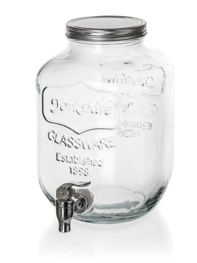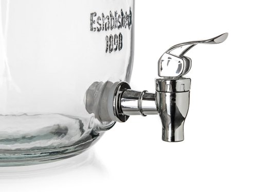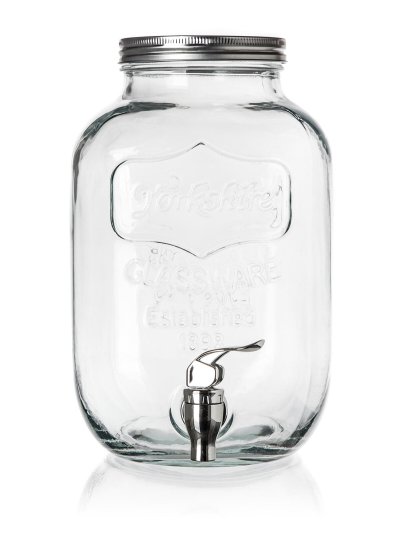 Skleněný zásobník na nápoje o objemu 5,2 l, slouží k servírování osvěžujících nápojů na oslavách a letních párty. Zásobník je vyroben z kvalitního čirého skla a je opatřen praktickým plastovým kohoutkem pro dávkování nápojů. Zásobník je určený k podávání pouze chladných a svěžích letních nápojů typu domácí limonáda, ovocný džus, ledový čaj a podobně. Široké hrdlo umožňuje do nádoby pohodlně vkládat led nebo kousky ovoce.