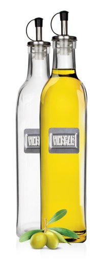 Sada lahví na olej a ocet. Hranaté skleněné lahve s kovovou nálepkou, plastovým uzávěrem a těsněním.