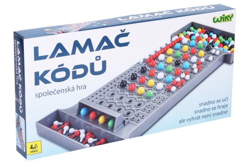 Lamač kódů společenská hra. Obsah balení- návod, hrací deska, 108 kódovacích kolíků v 6 barvách, 30 červených indikačních kolíku, 30 bílých indikačních kolíků.