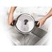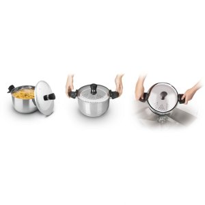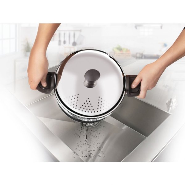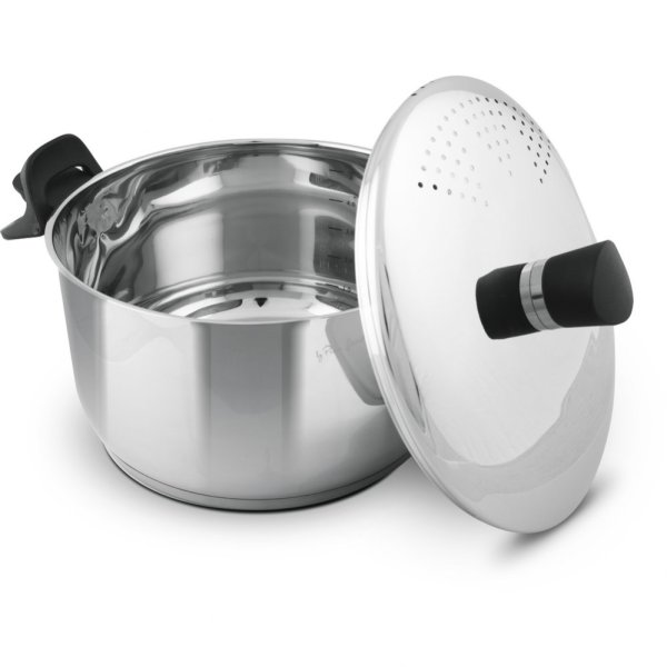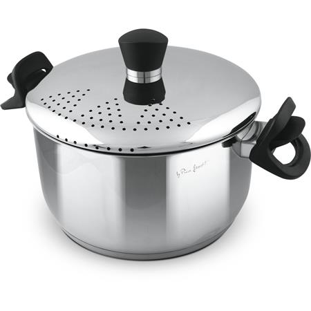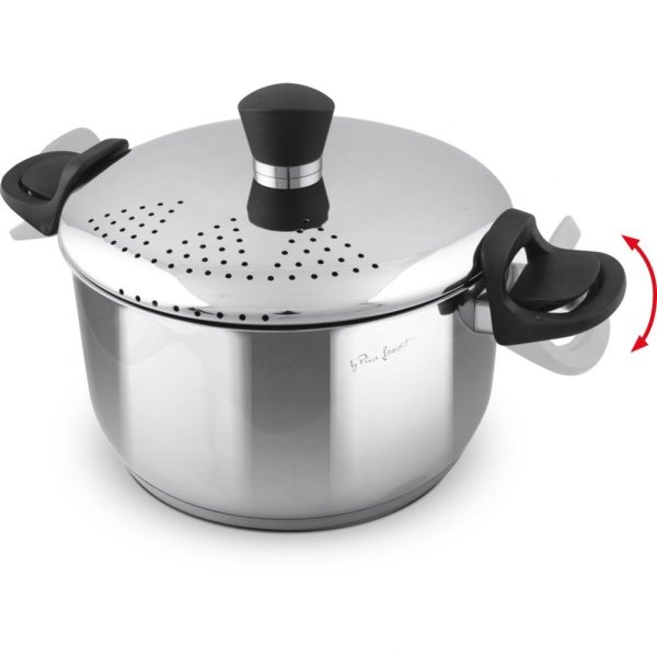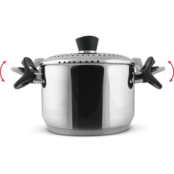 Poklička s cedícím mechanismem z nerezavějící oceli se speciálním zachycením pomocí výklopných rukojetí pro komfortní cedění těstovin.