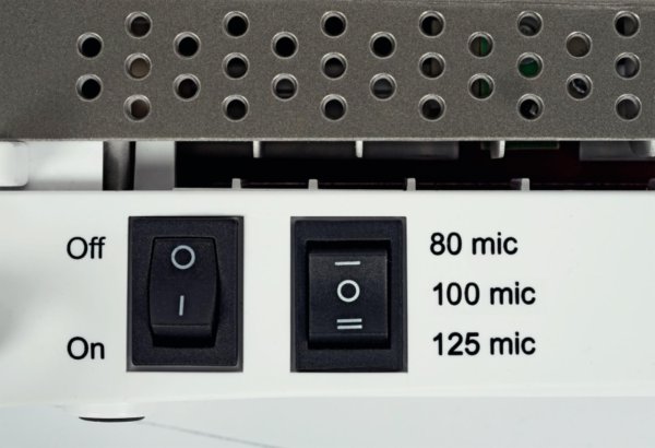 • Kolébkový přepínač umožňuje výběr ze tří úrovní tloušťky kapsy pro všestranné použití a splnění všech požadavků na laminaci