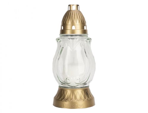 Hřbitovní lampa s čirým sklem a jemným zdobením, se zlatým plastovým víčkem. Hmotnost náplně: 115g. Doba hoření: 30h. Velikost: průměr 11cm, výška 26cm.