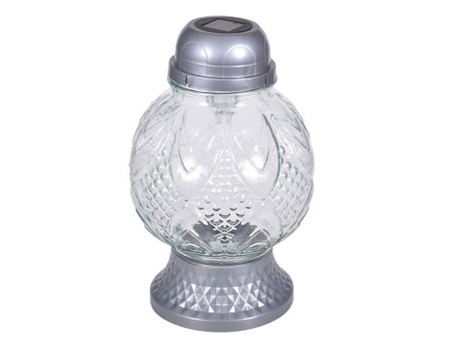Skleněná hřbitovní lampa ve tvaru koule, s bohatým reliéfním zdobením. Sklo je čiré, doplněné o plastový podstavec a víčko. Ve víčku je zabudován solární panel se soumrakovým senzorem, který zajistí automatické rozsvícení po setmění. Díky solárnímu napájení odpadá nutnost výměny náplní, což zajišťuje pohodlné a dlouhodobé použití při dekoraci pietních míst. Rozměry: průměr 19 cm, výška 27 cm. Barva: stříbrná.