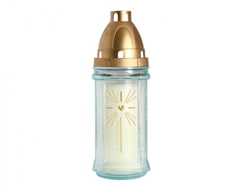 Hřbitovní lampa s bílým sklem zdobeným zlatým křížem se srdíčkem uprostřed a svatozáří okolo, se zlatým plastovým kuželovitým víčkem. Hmotnost náplně: 200g. Doba hoření: 42h. Velikost: průměr 7,5cm, výška 22cm. Barva: čirá.