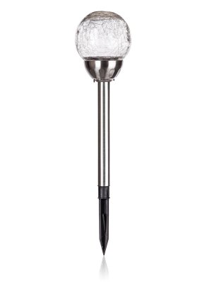 Lampa solární KOULE 10 cm, v. 38,5 cm, 2LED, čirá, popraskaná. rozměry (pr. x V): 10 x 38,5 cm Solární nerezová lampa o výšce 38,5 cm, se skleněným dekoračním stínidlem ve tvaru koule s pavučinovým dekorem …