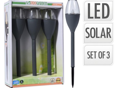 • třídílná sada venkovních LED solárních lamp- vhodné k osvětlení celé zahrady, terasy, balkonu, verandy, chodníčků, altánků, atd...- určené k zapíchnutí do země ale např. i do květináčů- teplé bílé světlo, efekt plápolající svíčky- solární panel v horní části přes den lampu nabíjí, ta se večer při setmění spustí a svítí- lze kdykoliv i manuálně zapínat nebo vypínat tlačítkem- průměr 5 cm- celková výška i s bodcem: 38 cm- integrovaná baterie nabíjená slunečním zářením je součástí balení- sada obsahuje 3 ks svítidel