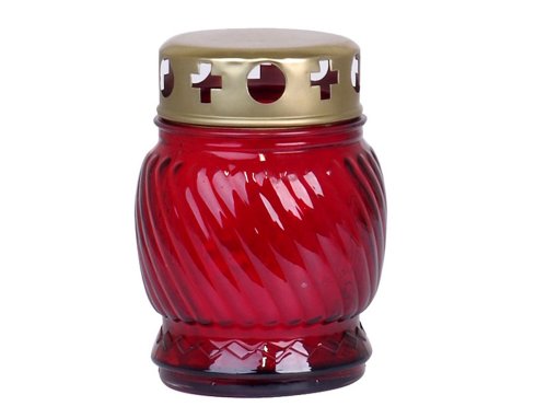 Hřbitovní lampa se zdobením, soudkovitého tvaru. Je vyrobena ze skla, podstavec a víčko jsou kovové. Vosk je nalitý přímo v lampě. Hmotnost náplně: 25 g. Doba hoření: 7 hodin. Rozměry: výška 10 cm. Barva: červená, zlatá.
