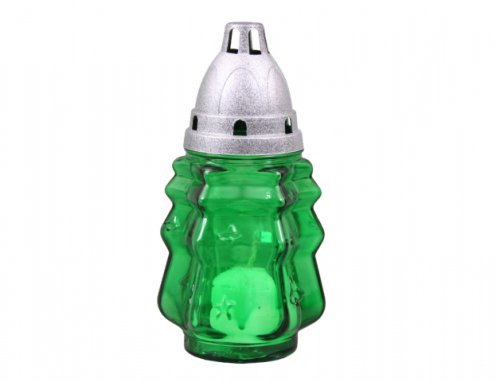 Skleněná hřbitovní lampička v podobě vánočního stromečku se stříbrným plastovým víčkem. Hmotnost náplně: 40 g, délka hoření: 10 hodin. Šířka: 9 cm, výška: 19 cm.
