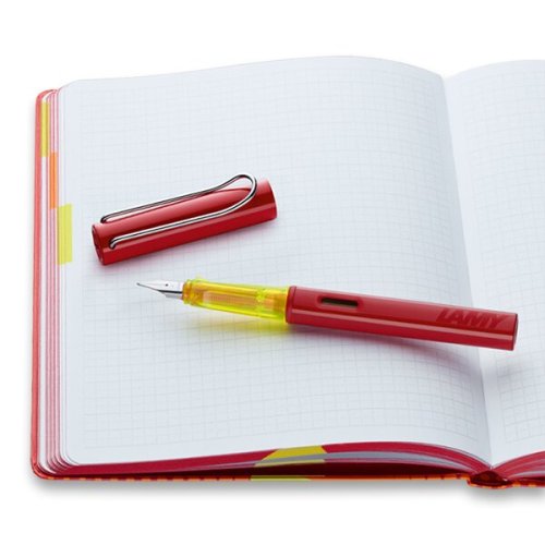 Oblíbené plnicí pero LAMY AL-star je nyní k dispozici v inovativní barevné kombinaci s tělem v lesklé signální červené barvě s úchopovou částí v neonově žluté, průhledné, barvě., Přívod inkoustu v oranžové barvě. Tělo vyrobené z lehkého eloxovaného hliníku dává psaní lehkost., PLNICÍ PERO:, * ergonomicky upravená transparentní úchopová zóna s oranžovým přívodem inkoustu, * odpružený kovový klip, * nasazovací víčko, * hrot z leštěné nerezové oceli, * možnost použití jak inkoustových bombiček, tak i plnění pera inkoustem z lahvičky, Dodáváno s modrou bombičkou a druhou úchopovou částí s černým přívodem inkoustu., ZÁPISNÍK:, Zápisník s měkkou, v horním hřbetu šitou vazbou v kartonových deskách, obepnutý pružnou páskou proti samovolnému otevírání. Posledních 8 listů je možno díky perforaci snadno, vytrhnout. Zápisník je vybaven poutkem na psací potřeby, kapsou na vizitky a drobnosti, která je vyrobena z tkaniny a kartonu a 2 ks textilních záložek. Gramáž papíru 90 g/m², neobsahuje, kyseliny, chamois (slonovinová) barva papíru., Rozměry: 14,5 x 21 cm, 96 listů, linkovaný.