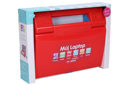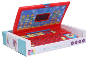Laptop dětský - mluví česky. Rozměry 24x19,5 cm. Světelné a zvukové efekty. 3xAA baterie součástí. Součástí drátová myš. Tlačítko ON/OFF - aktivace displeje. Výuka abecedy, slov, čísel, melodie, hry, hodiny, opakovací funkce, nastavení hlasitosti, podsvícení displeje.
