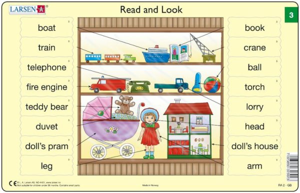 Puzzle Angličtina – slovíčka RA2 16 dílků Rychle a snadno se naučte vybraná slovíčka v angličtině! Puzzle má jeden velký centrální obrázek a osm dílků s anglickými slovíčky na každé straně. Každý dílek obsahuje šipku, která směřuje k odpovídajícímu objektu v centrálním obrázku. Toto zábavné a jednoduché cvičení umožní dětem naučit se 16 anglických slovíček.