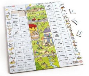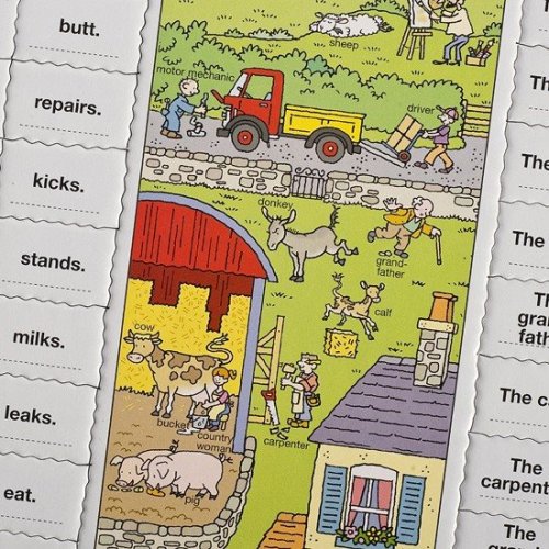 Puzzle pro výuku angličtiny - tvoření jednoduchých anglických vět. Co dělají zvířátka a lidé na obrázku? Zábavné učení angličtiny nejen pro děti. K jednotlivým obrázkům na okraji se přiřazují dílky s podmětem (KDO, CO) a přísudkem (CO DĚLÁ?) a tvoří se jednoduché věty. Uprostřed je vyobrazena kompletní scéna včetně anglického pojmenování dané osoby, zvířete či věci. Děti, které neznají anglické slovíčko patřící k obrázku na okraji, si jej mohou nejprve vyhledat na obrázku uprostřed. Každý dílek má jiný tvar a celé puzzle lze složit, jen když jsou všechny dílky umístěny správně.