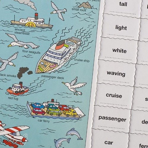 Puzzle Hodina angličtiny se 864 dílky jsou výukové puzzle zaměřené na tvorbu jednoduchých vět. Obrázky zobrazují aktivity zvířat a lidí, poskytují zábavný prostor pro učení angličtiny. K jednotlivým obrázkům na okraji lze přiřadit dílky obsahující podmět (KDO) a přísudek (CO DĚLÁ?), čímž se utvářejí jednoduché věty. Uprostřed je zobrazena kompletní scéna s anglickým pojmenováním osob, zvířat nebo věcí. Každý dílek má unikátní tvar a celé puzzle lze složit pouze tehdy, jsou-li všechny dílky správně umístěny.