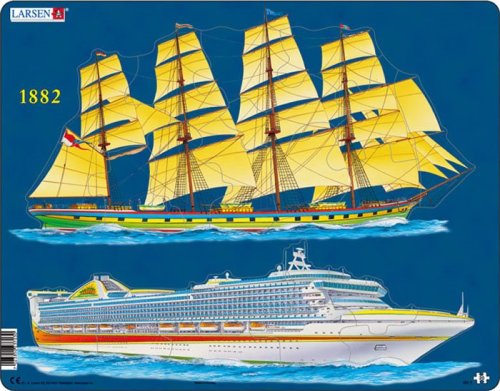 Srovnání dnešní lodní dopravy a dopravy z roku 1882. Nepravidelné dílky se umisťují do dvou samostatných rámů ve tvaru plachetnice a zaoceánské lodi. Puzzle LARSEN má pevný okraj, aby bylo pro děti skládání jednodušší, a zespodu jsou otvory pro snadné vyjmutí dílků. Díky deskovému provedení se puzzle LARSEN dobře skladuje. Obrázky jsou graficky velmi poutavé, každý dílek je rozdílný a originální, čímž vybízí děti skládat jednotlivé motivy znovu a znovu. Norský výrobce LARSEN s dlouholetou tradicí (první puzzle uvedl již v r.1953) se specializuje především na výrobu dětských vzdělávacích deskových puzzle. S tímto úzkým zaměřením se stal špičkou ve svém oboru, výrobky vyrábí až v 18 různých jazycích včetně češtiny. LARSEN má ve své nabídce více než 300 deskových puzzle a vyváží do více než 30 zemí světa. Rozměr složeného puzzle cca 36,5 x 28,5 cm