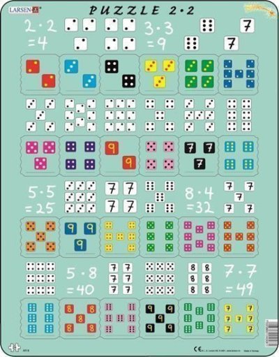 Puzzle Násobení s kostkami 24 dílků pro začátečníky. Výuková skládačka LARSEN poskytuje praktický trénink pro procvičování malé násobilky. Úkolem dítěte je nalezení dílku, který odpovídá danému matematickému zadání a dosahuje stejný výsledek. Každý dílek má odlišný tvar a celé puzzle lze složit pouze tehdy, jsou-li všechny dílky správně umístěny.