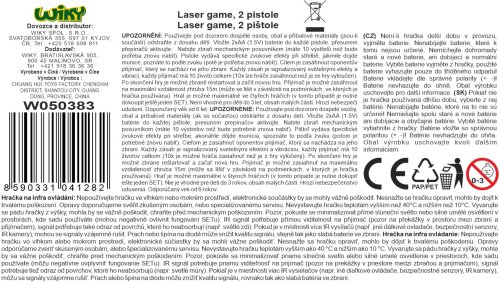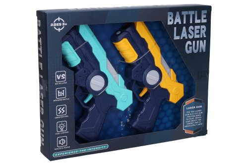 Laser game 2 pistole. Velikost 20 cm. Světelné a zvukové efekty. 2xAA baterie do každé pistole nejsou součástí. Obrázkový návod s popisem na ovládání na zadní straně obalu. Aktivace hry přepínačem v zadní části pistole, nabíjení natahovacím mechanismem pod hlavní.
