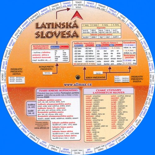 Jedinečné a gramaticky velmi obsáhlé oboustranné kolečko obsahuje celkem 80 nejpoužívanějších latinských sloves.Pomůcka na obou stranách obsahuje gramatické tabulky se spoustou užitečných informací.Pomůcka je vhodná jak pro začátečníky, tak i pokročilé studenty latiny.